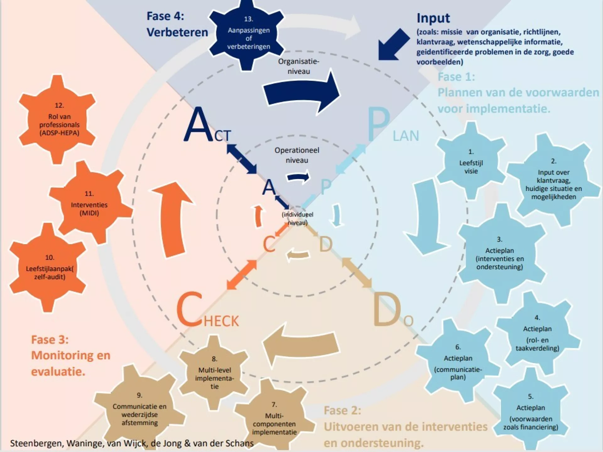 Vanuit deze visie hebben we de eerste stappen gezet. Allereerst door aansluiting te vinden bij de projecten ‘Cosis Rookvrij’ en ‘Gezonde, duurzame en veilige voeding’. Verder zijn we op 5 locaties gestart met de Plan-fase van de Plan-Do-Check-Act cyclus die is opgesteld voor een gezondere leefstijl.